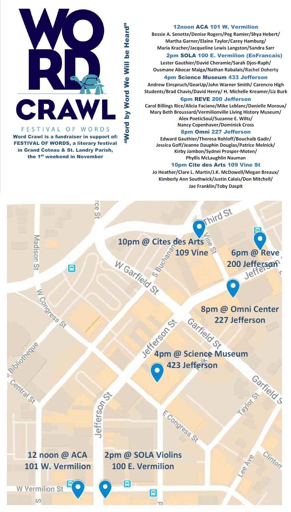 You can also request an application packet from Patrice Melnick at 337-254-9695 or festivalwords@gmail.com; or Marie Touchet at aziesbusiness@gmail.com