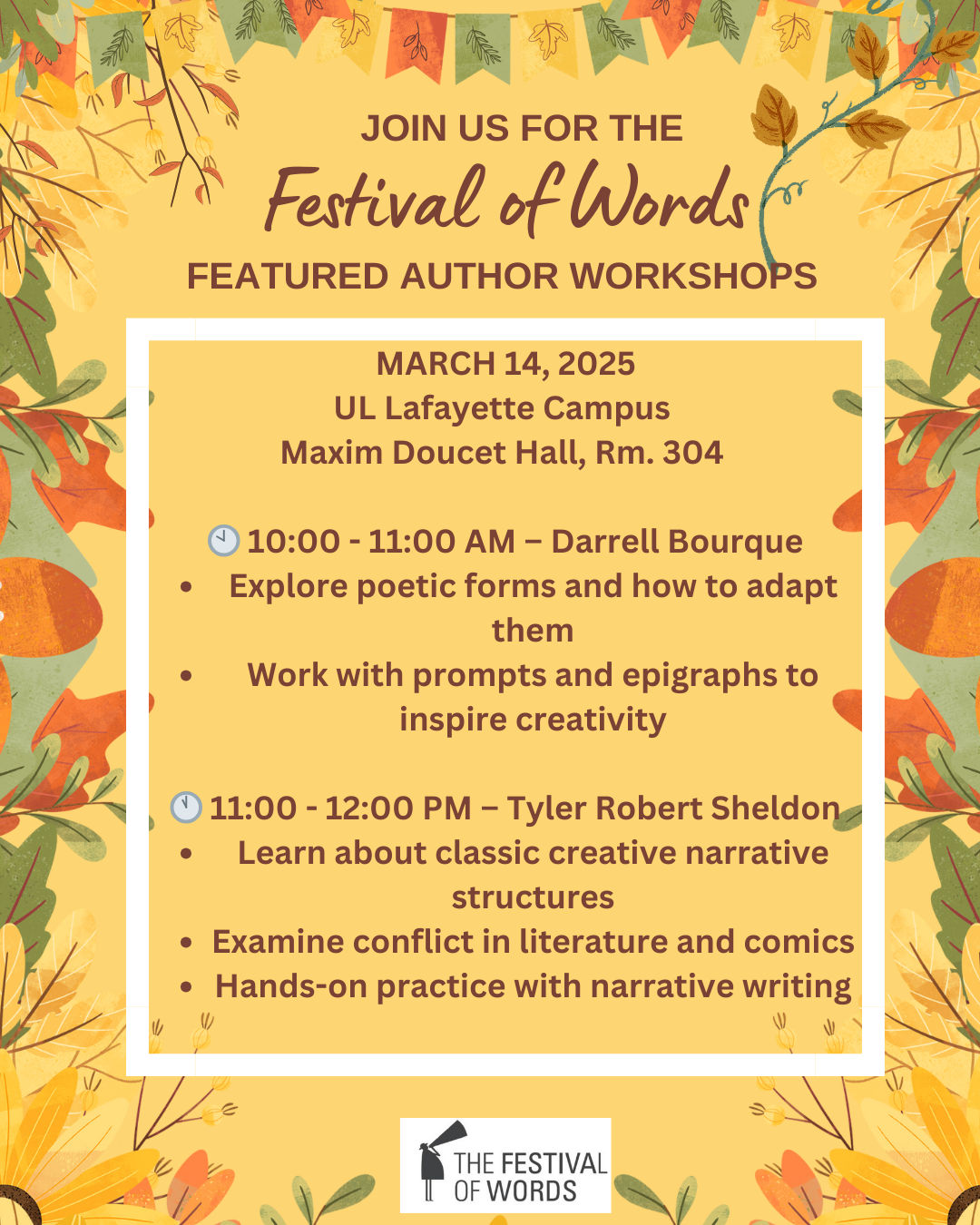 Workshops are available on a 1st come, 1st served basis. To reserve a place, please send a donation of $10 ($20 for 3-workshop package) or more, and your place will be reserved. PAYMENTS can be made through ZEFFY, or checks can be mailed to Festival of Words,506 Plaza Village Drive, Lafayette, LA 70506
